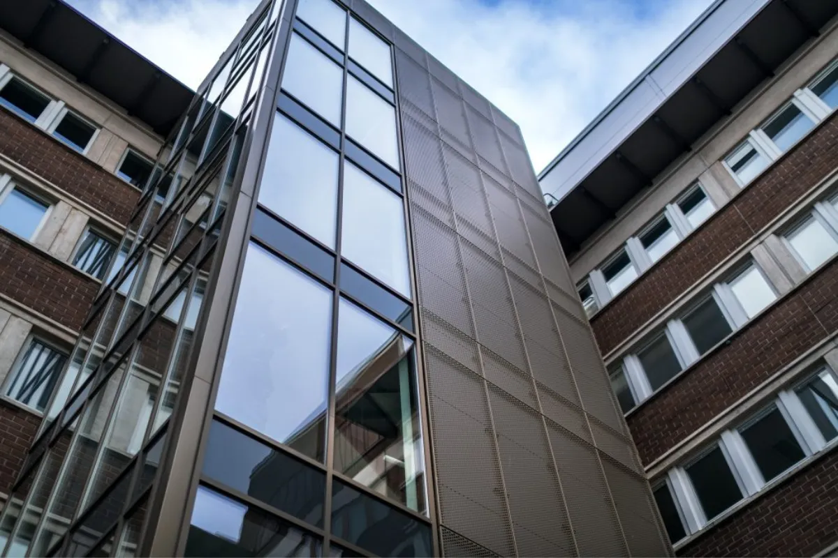 Projektet omfattade montering av specialtillverkade perforerade aluminiumkassetter på ventilerad bärstruktur.